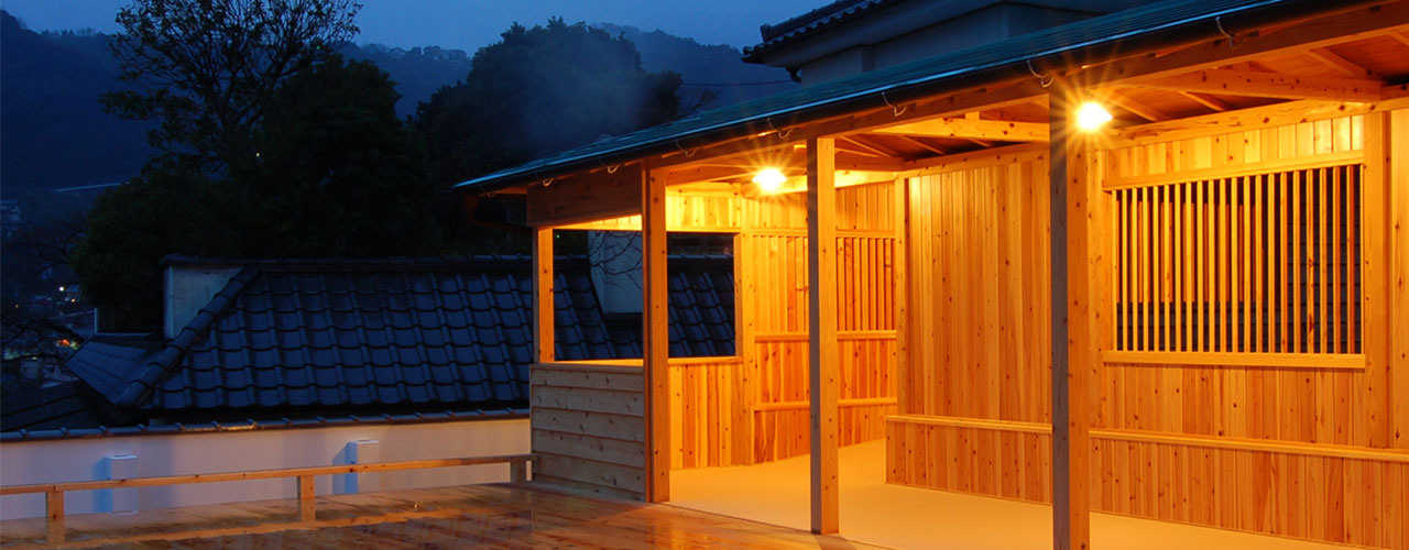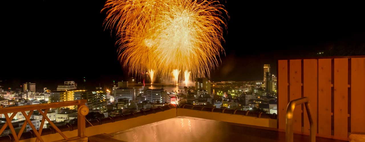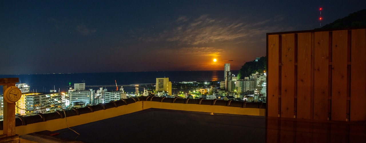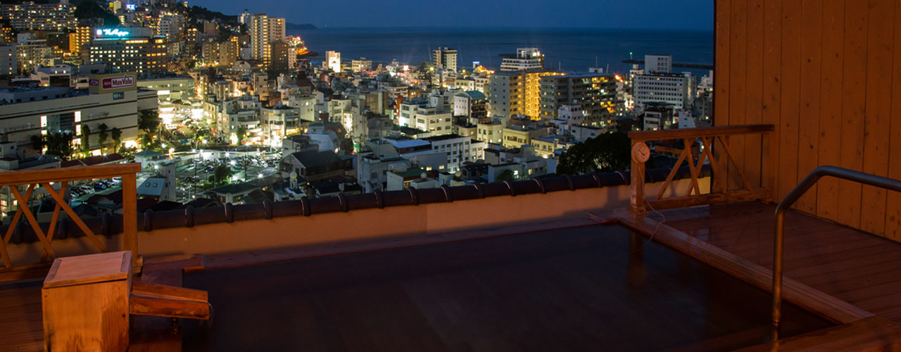 当館は花火が綺麗に見える高台の旅館で、お部屋に備え付けの月見台からは、四季折々の熱海をお楽しみいただけます。