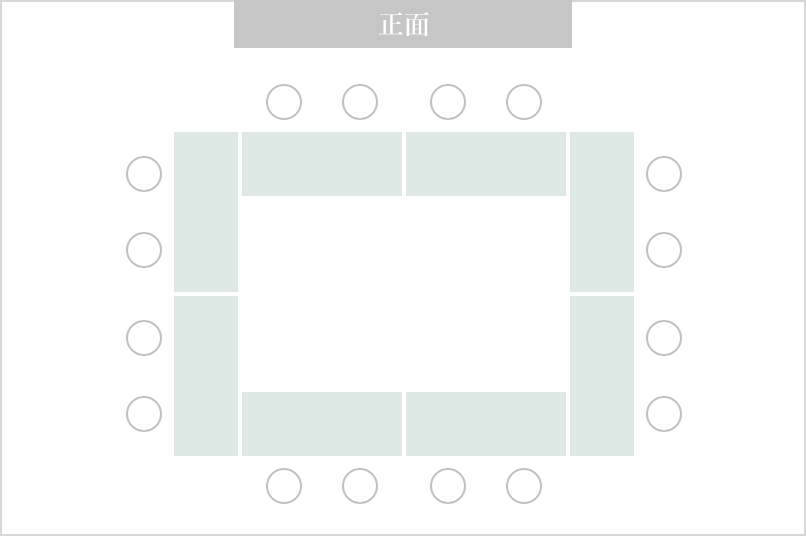 参加者同士の顔が見える配置で、会議や意見交換、役員会に最適。発言しやすく、議論を深めたい場面に向いています。 最大収容人数:40名