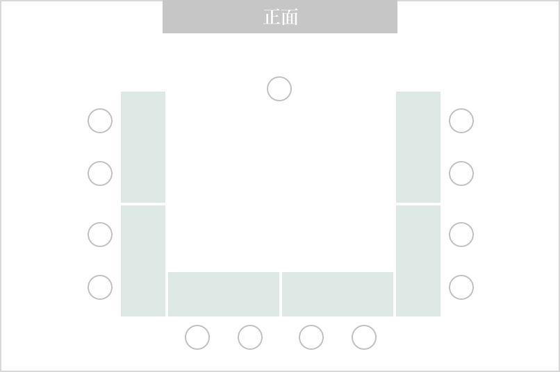 前方を空けたロの字に近い配置。講師がいる研修や、説明+質疑応答がある会議に向いています。 最大収容人数:30名